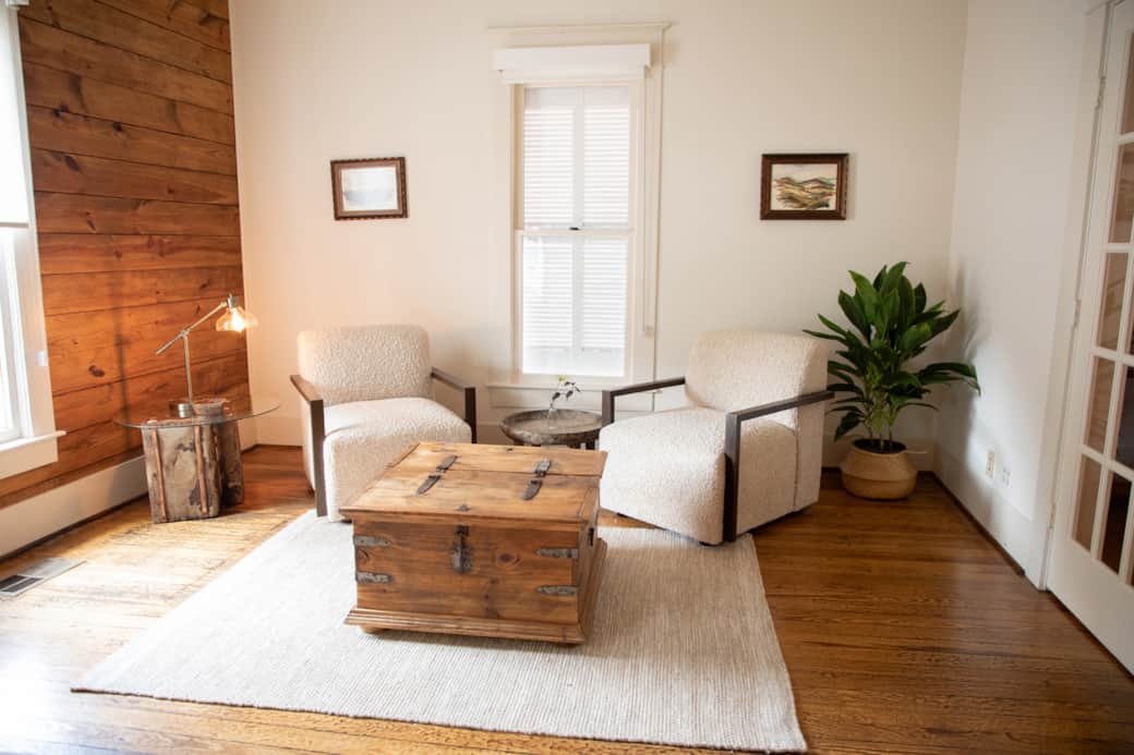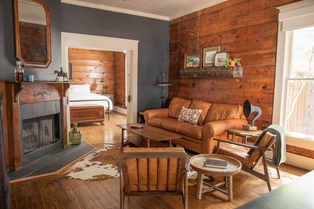 Designed for connection and relaxation, this full-home retreat sleeps up to nine guests across three thoughtfully appointed suites. Original shiplap walls and wood floors preserve the home’s century-old character, while the updated furnishings, stocked kitchen, and cozy outdoor spaces add a touch of contemporary ease.